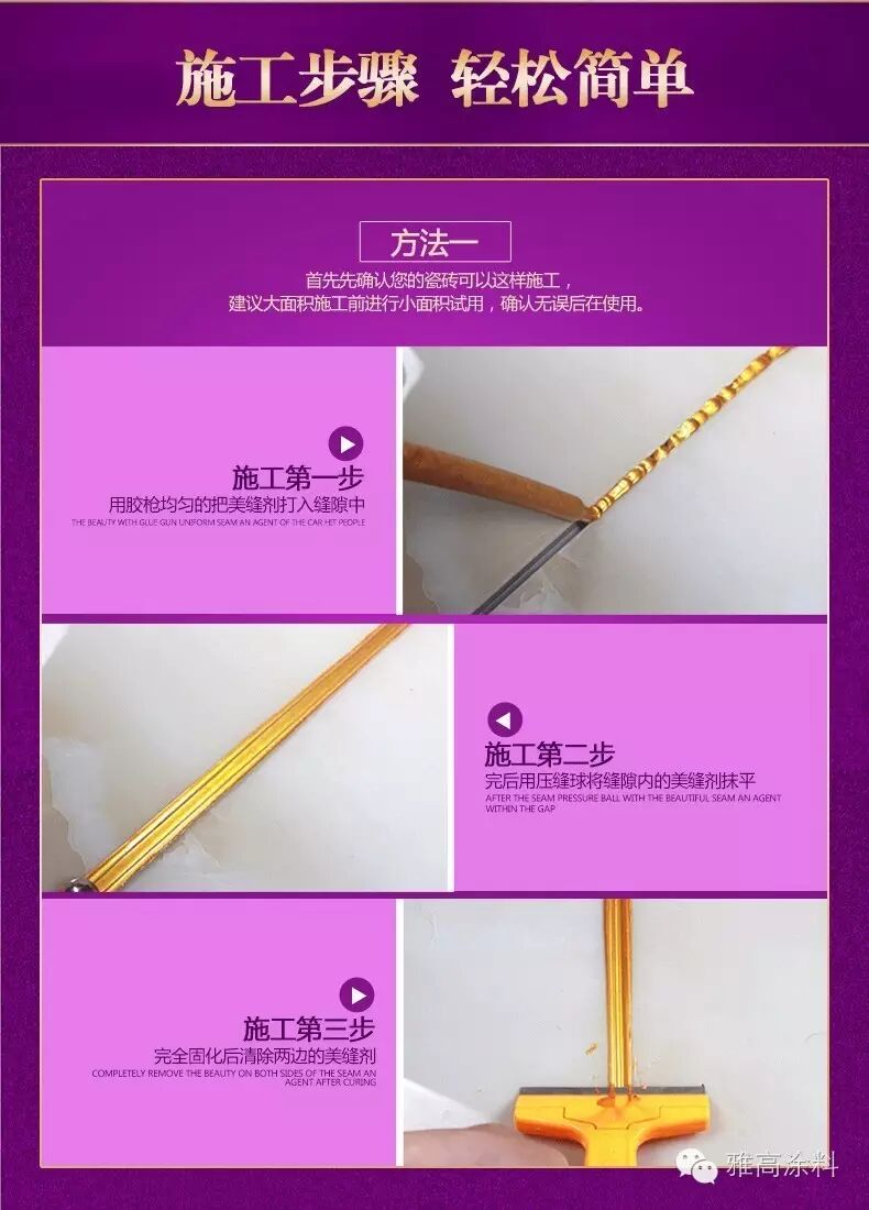 ⑦成品保护:常温25度以下,3小时表干,24小时使用强度,自然养护7天。美缝后24小时内要避免受到污染、雨淋、水冲、地面上避免行走。