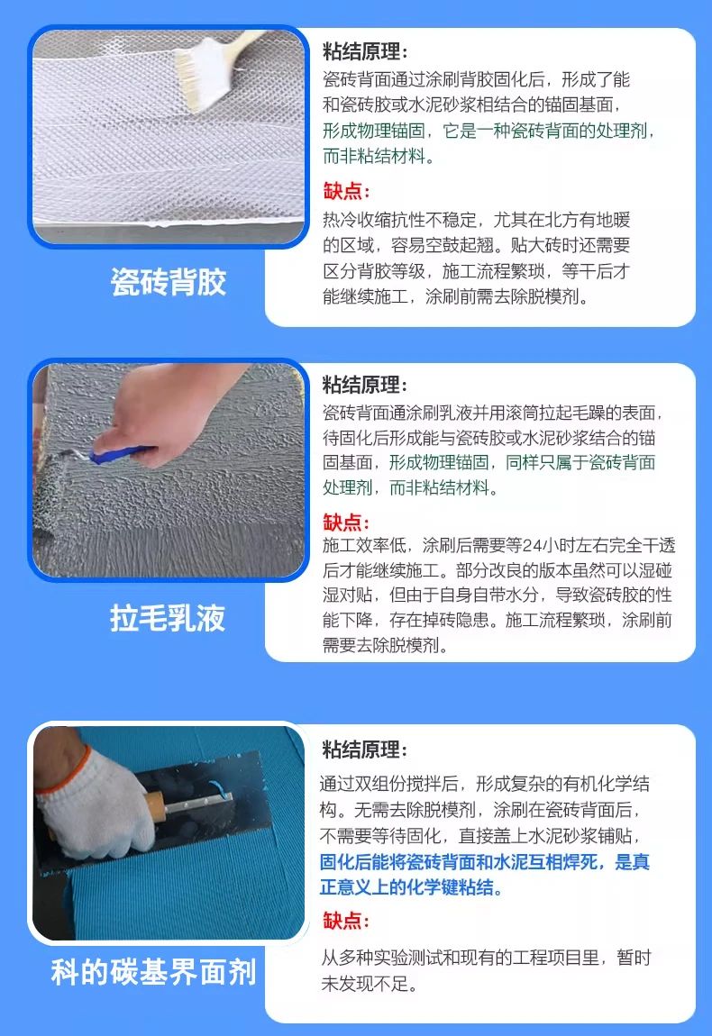 科的碳基瓷砖胶,不仅满足多种场景需求,更具超强耐候性及耐老化性能,粘结强度高具备化学键 、机械锚固、氢键、界面层活化五合一粘结原理,粘结强度对比传统的乳液基界面剂或背胶高出5倍以上。
