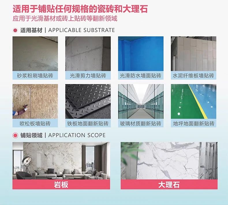 无论是墙面砖还是地砖,室内还是干燥区室外,科的碳基背胶均能完美胜任,通用性极强。使用科的碳基瓷砖胶,无论什么基材、基层、规格、吸水率、通通一“胶”搞定。