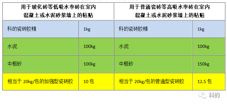 现有的瓷砖胶粘剂建议的是薄层满贴法仅仅适用于基面平整的板材上施工,针对中国特有抹灰基层不平整的情况,科的瓷砖胶精加水泥砂子现场配制的胶粘剂更适用。