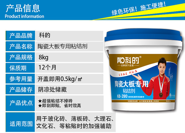 产品在一个市场上有长期的发展空间,离不开各行业各业的相互相助。大板瓷砖成为趋势,也越来越多人选择。解决大板瓷砖上墙粘贴的问题也能得到解决。科的大板背胶是一种涂刷于瓷砖背面的高分子自交联改性共聚物的胶结材料,其核心高分子共聚物采用欧盟进口材料,其对各种低能表面,均具有非常高的粘结性,确保更高粘贴安全性。粘结力和渗透力极强,它是通过化学粘贴原理,靠背胶分子相互渗透作用来达到粘结的。科的背胶涂在大板背面,渗透到大板的毛细孔里,交汇成织网状结构;然后再涂上水泥砂浆,科的背胶分子与水泥分子通过布朗运动相互渗透、聚合凝固后,形成交错的枝蔓状结构,使得瓷砖和基面形成一个整体,从而杜绝掉砖的发生。而且它不受外部环境的影响,耐水、耐高温、耐冻融,即便遇上极端的气候条件也具有超强粘接力。从真正意义上解决了大板上墙铺贴的难关,让行业难题迎刃而解。