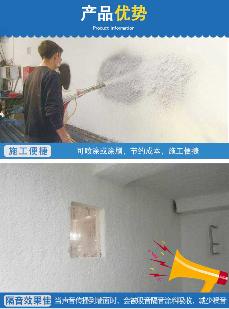 隔音涂料里同时还有部分吸音纳米材料,吸音纳米材料表面充满了直径为 1um左右的小孔,小孔由表面向中心深入,孔的容积占颗粒面积50%左右,因此具有良好的吸附性能,且对目的物有缓释作用。