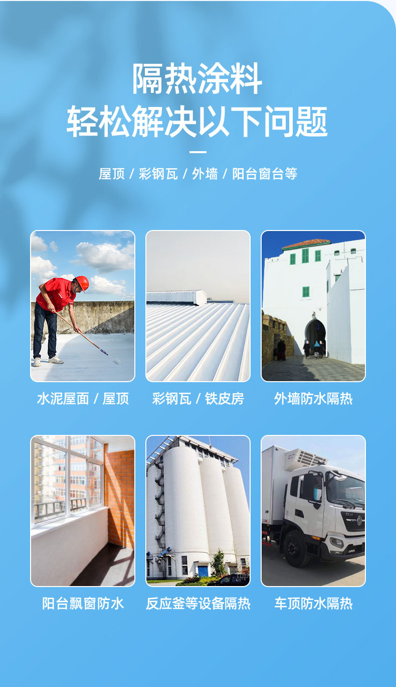 防水隔热涂料可广泛应用于建筑外墙、屋面、钢结构、化工储罐、仓库等需要隔热防水的项目工程。有了它,再也不怕夏季高温了。