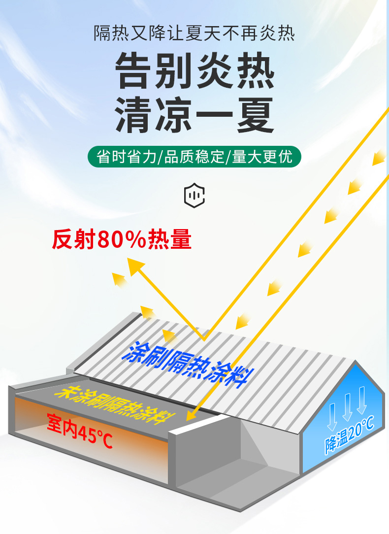 安全、环保、节能。漆膜高效反射太阳光的性能,在太阳直射时能体会到温度明显降低15-20摄氏度。是建筑物隔热、节能的经济之选。