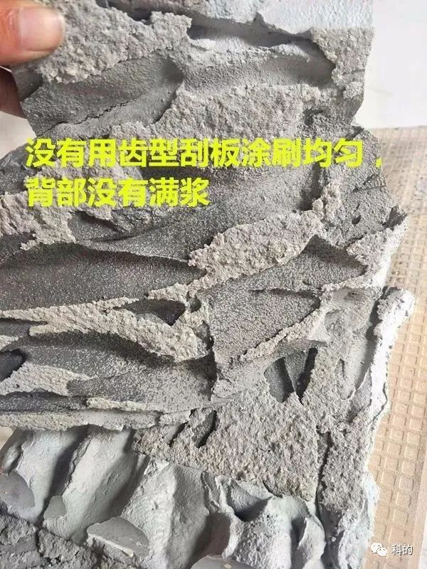 并且没有用齿型刮板。砂浆过厚会导致固化速度不同而收缩,进而引起空鼓和脱落。