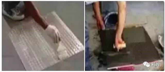 涂刷瓷砖胶施工。如果没有等待其透明,则起不到任何增加瓷砖胶粘结力的作用。