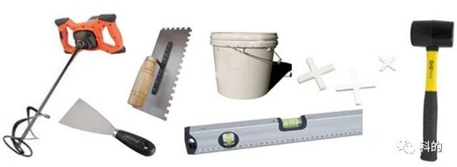 砂浆胶、电动搅拌器、铲刀、齿形刮板、坚固塑胶桶、水平尺、塑料十字架、胶锤等。