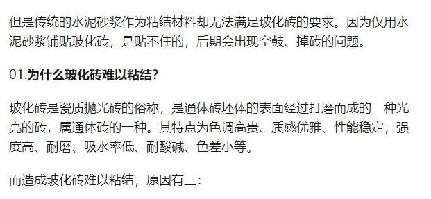 瓷砖粘结剂广泛适用于低吸水率、质地较密、表面光滑的石材,如墙地瓷砖、大理石、天然石材等。