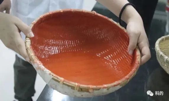将水倒入提前涂刷了科的超强红橡胶外露型防水涂料的竹篮里。观察防水效果,没有发生任何渗漏情况。