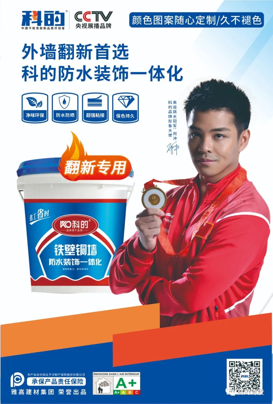 科的外墙防水装饰一体化涂料整体优势①构造层次优化②安全、防水③环保耐污耐用⑤综合成本优化。外墙迎水面真正防水,1500h以上超耐候,历久弥新,防水透气,不起鼓,官方认证,更环保更安全。耐污性强,更耐久、更耐看。优异的拉伸强度和粘结强度,确保涂层不开裂、不脱落,耐人工气候老化性,耐老化时间长,确保30年不褪色,不起粉。无需额外增加防水层,解决外墙渗漏问题,防水+装饰“二合一”,抗反碱,耐高温水洗刷,确保外墙恒久靓丽如新。环境友好型:VOC、甲醛、笨系物、可溶性重金属等有害污染物含量远由于国标要求。
