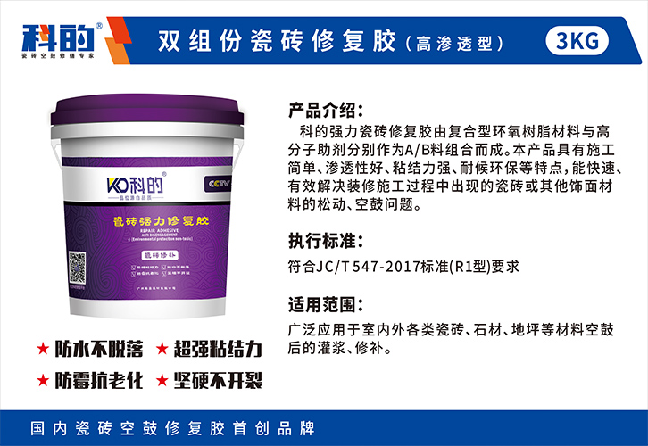 第三,权威认证是消费者选择科的瓷砖修复胶的重要因素之一。作为一家专业从事瓷砖修复领域多年的品牌公司,科的不仅拥有雄厚的技术实力和丰富经验,在产品质量上也始终保持着高标准。科的所生产出来的每一款产品都经过严格检测,并获得了权威认证机构颁发的相关证书。这为消费者提供了安全放心、可靠品质保障。