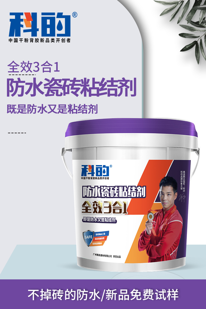 科的防水瓷砖粘接剂全效三合一为水性绿色环保产品,全效三合一防水瓷砖粘接剂(墙面、地面、瓷砖背面通用)具有刚柔并济、粘结超强、渗透型号、防水防渗漏、不易开裂、耐老化、耐高低温、