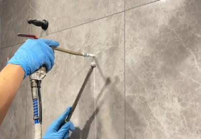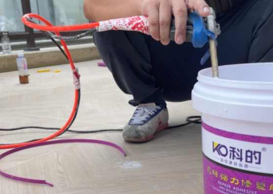 随后,在将瓷砖空鼓修复胶充分搅拌均匀后,我们便可以将科的专用灌胶枪的注射嘴插入先前钻好的小孔之中,将修复胶注入其中。值得注意的是,在注入修复胶的过程中,应注意控制力度并采取间歇式循环注入方式,以避免过大的气压导致瓷砖破裂。同时,还需通过敲击瓷砖听取声音来判断空鼓修复胶是否已成功填充到位。在完成灌注后,可用棉签封堵住小孔。
