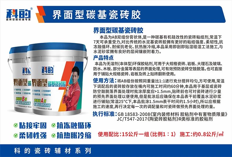 科的碳基瓷砖胶有强大的渗透与粘结能力,直接作用于瓷砖背面,