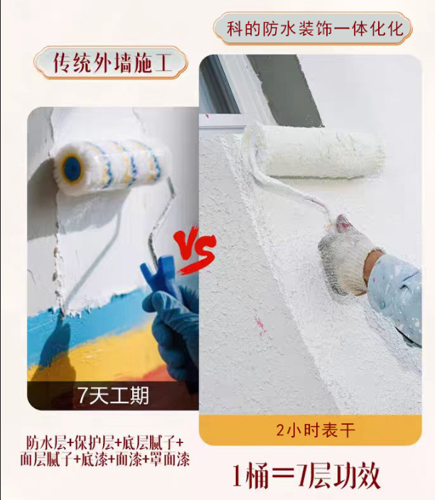 外墙翻新,最怕两件事:做完防水不好看,做好装饰不防水。传统工艺要刷腻子、做防水、上面漆,五六道工序,费钱又费时,没过几年又渗水、开裂、褪色。